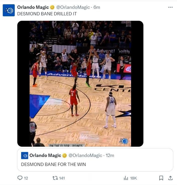 终场前10秒格兰特2+1反超魔术2分,随后终场前6秒班凯罗上篮命中还制造犯规,但他的准绝杀罚球未能命中,终场前1秒班凯罗抢断霍勒迪的传球立功,魔术暂停。魔术队就用这一秒钟为贝恩布置了一个接球出手的战术,最终贝恩在距离三分线一步的距离命中了一个漂移三分。